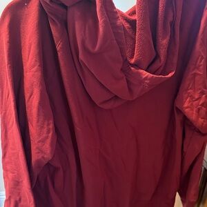 Bold cherry red jacket with a full zip. Features a cozy hood and drawstrings. Ideal for layering and casual wear.