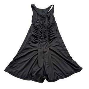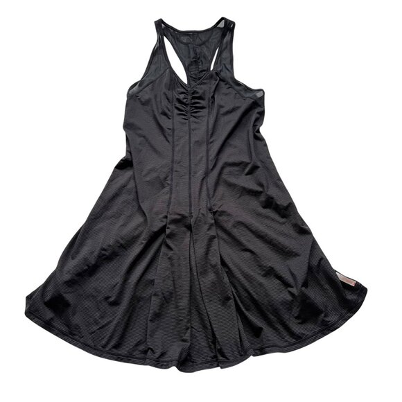 Zella athletic dress, sleeveless, black with stripes, pleats, ruched back, mesh straps, racerback, scoop neck, breathable and thin fabric, women's small, pit to pit: 14", length: 31-34", gently used, no visible flaws
