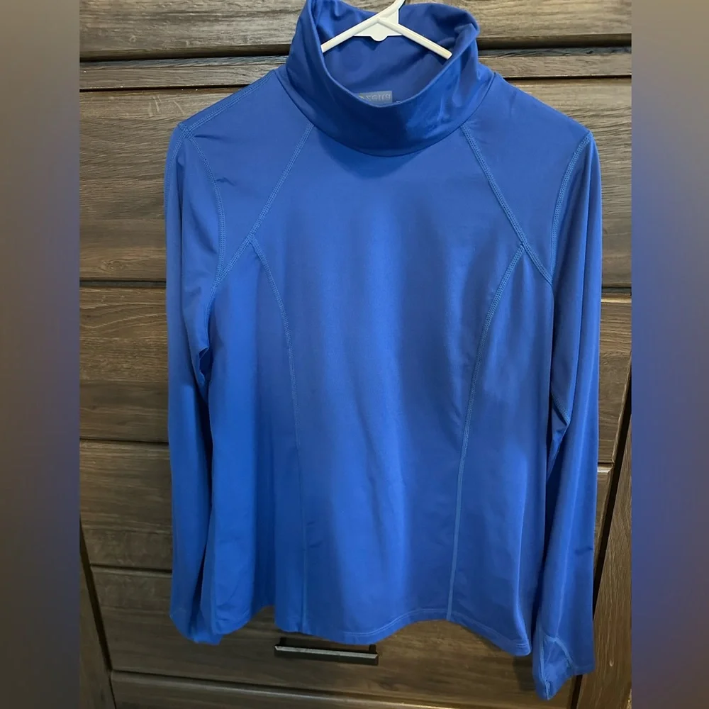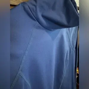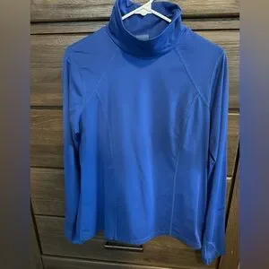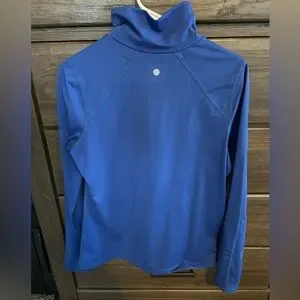 This performance turtleneck by Zella (Nordstrom’s athleisure line) is so warm! Perfect for activity in the colder weather as it’s lined with brushed fleece inside and has thumb holes. Minor wear, well loved by me! No longer fits. This is a royal blue color, nice and bright!