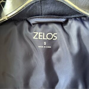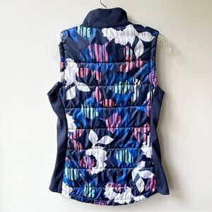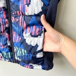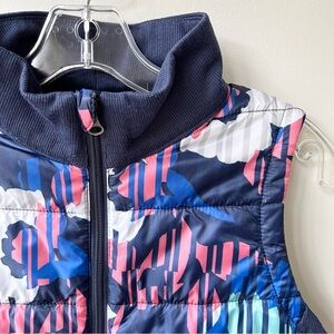 Features stretchy knit panels on sides and in neck, full front zip, side pockets, and navy / white / pink / blue print pattern.