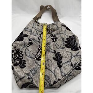 The Zen Amsterdam Tapestery Hobo Tote Purse Shoulder Bag is a stylish women's bag featuring a floral pattern in purple and silver tones. The bag has a beige handle/strap and lining, with an exterior made of tapestry material. Perfect for adding a touch of elegance to any outfit.