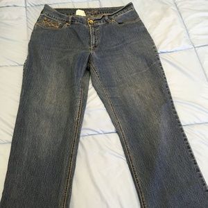 Zena Plus Size Jeans with wide waistband and large front button. Has stretch for comfort built-in. Crosshatch/Vintage Tatter Denim Wash. Gold thread and small gold rhinestones for a little bling. These are a Plus Size 16W and measure 38" Waist, approximately 30" inseam. Zena went out of business and doesn't make jeans anymore. These were sold at nice department stores like Nordstrom and Dillards once upon a time. In very good condition.