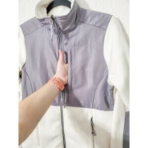Zena Sport Women's Cream And Gray Fleece Full Zip Up Jacket. This jacket is in like new condition! It is ivory/cream with gray along the top half and forearms. It has 2 zippered pockets at the waist and 1 zippered pocket on the left side of the chest. It is a full zip up jacket. It has a stand up collar that can also be folded down if desired. It has an adjustable stretchy drawstring along the hem for comfort. It also has snap button loops at the wrist cuffs. No rips, tears, or stains.