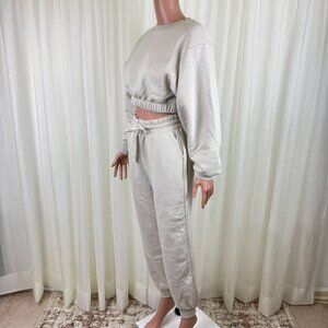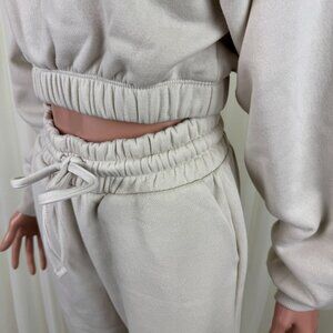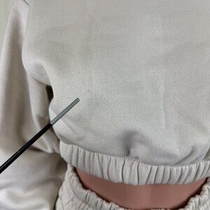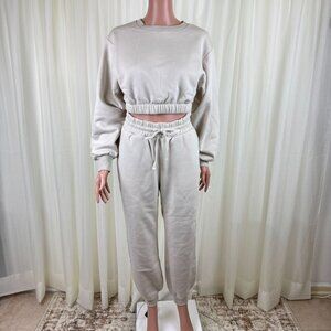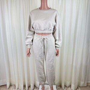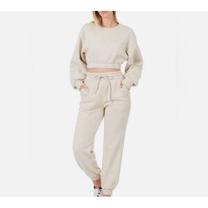 Women's Zenana 2 Pcs Crop Sweatshirt Tracksuit High Waist Jogger Set Outfit Active Loungewear Cream