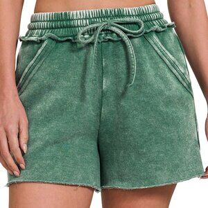 Zenana Acid Wash Fleece Drawstring Shorts with Pockets, Dark Green