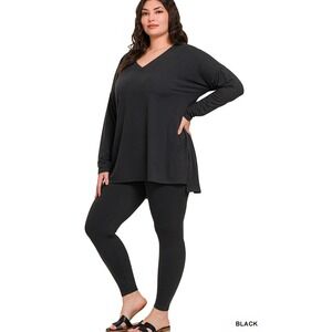 brushed DTY microfiber loungewear set in classic black. Made from ultra-soft, stretchy fabric with a luxe feel, this two-piece set includes a relaxed-fit long sleeve top and matching high-waisted leggings. Designed for all-day wear, lounging, or travel, it offers perfect stretch and recovery for every body type—available in both regular and plus sizes. The top features a flattering v-neck and longer length, while the leggings have a smoothing fit you'll love.