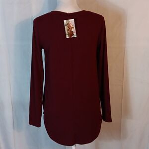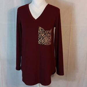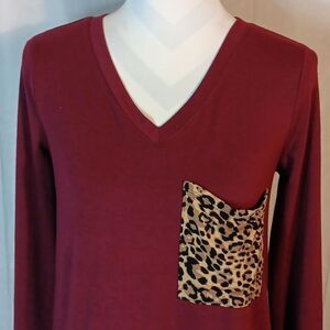 Elevate your style with this chic New with tags burgundy long sleeve top featuring a trendy leopard print pocket. Size Small with a pit to pit measuring 19" and a length of 29". Perfect for casual outings or a night out.