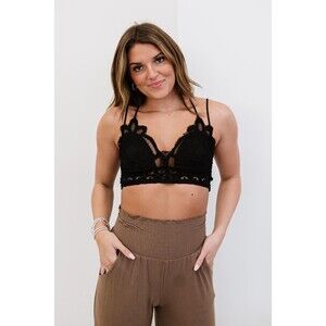 Our Forever Flirty Full Size Lace Bralette has adjustable double-straps that cross in the back, triangle shaped cups, and a scalloped eyelash detail longline hem! To add to that, it also has a smocked back and removable pads.