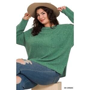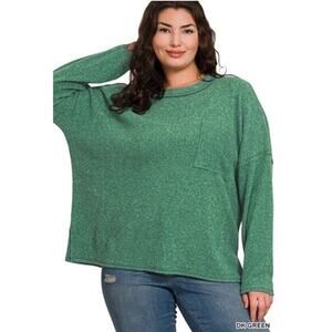 Keywords: Zenana plus size sweater, green knit top, cozy brushed hacci, soft pullover, casual fall outfit, comfy chic sweater, oversized relaxed fit, ribbed knit top, weekend wear, Woodman’s Boutique