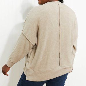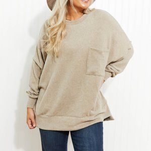Oversized sweaters are just about as cozy as it gets! The coziness is amplified in this sweater by slouchy sleeves with dropped shoulders and the softest brushed melange fabric. Plus, it has cute details such as a breast pocket and a center seam detail in the back!