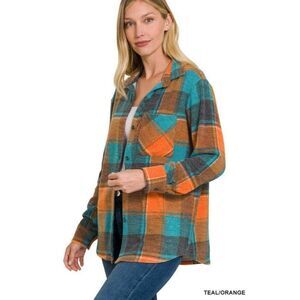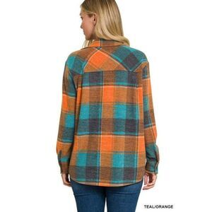 Zenana Making S’mores Plaid Flannel Shacket in Teal/Orange S-L QJL-1368Y