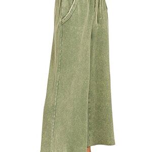 Zenana Mineral Washed French Terry Palazzo Pants with Pockets, Light Olive
