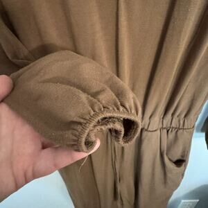 Zenana Outfitters Brown Jumpsuit in women's Size Medium. Long sleeves w/ elasticized cuffs. Henley Button Top Portion. Pockets. Elasticized waist with tie. One piece outfit in good used condition with no flaws or stains other than some wash wear. Please see close-up pictures for condition details.
