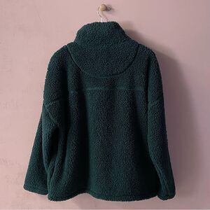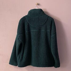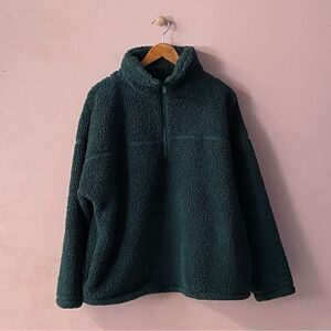 Green teddy quarter-zip pullover sweatshirt. Perfect for colder weather to layer on top of a turtleneck long sleeve shirt with jeans and sneakers. Has a little pilling, but still has some softness so it’s nice and cozy. Approximate measurements shown in photos. Feel free to ask questions or make an offer!