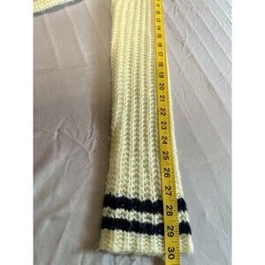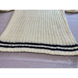 Zenana Outfitters women's ivory knit long-sleeve scoop neck sweater, size Large. This cozy knit top features striped accents on the cuffs and hem in a dark blue/black. Made from 100% acrylic, it's perfect for a relaxed, comfortable style. In excellent pre-owned condition with no noticeable stains or holes. 1062