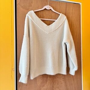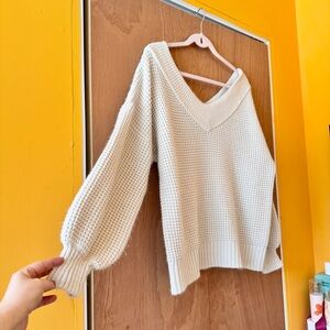 Ivory chunky knit sweater that features a Vneck, balloon sleeves and an oversized slouchy fit.