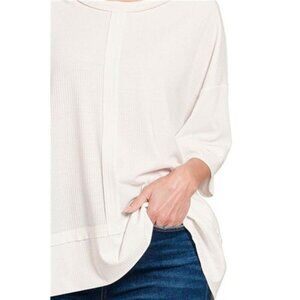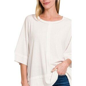 *This sophisticated casual t-shirt features a contemporary oversized silhouette in a soft ribbed texture. Made from a premium cotton blend that offers both comfort and durability. The quarter-length sleeves and dropped shoulders create a relaxed, modern look while the rounded neckline adds a feminine touch. The ribbed texture adds visual interest and dimension to this versatile piece. Perfect for both casual and semi-casual occasions, this t-shirt can be easily styled with jeans, skirts, or dress pants. The cream white color makes it an essential wardrobe staple that pairs well with any bottom.
