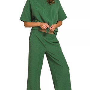 *This comfortable and stylish set includes a ribbed round neck tee and matching pants. Perfect for lounging at home or running errands in style. The ribbed texture adds a trendy touch to this classic silhouette. Made from soft and breathable fabric for all-day comfort. Elevate your casual wardrobe with this must-have set.