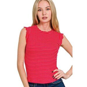Zenana Ribbed Ruffle Trim Sleeveless Stripe Top