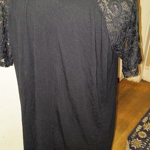 V-neck with a lace sleeves. Fabric has stretched to it. Fits true to size.