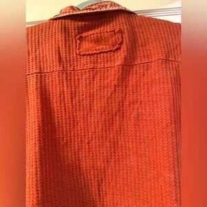 Stylish rust utility jacket with textured fabric. Features button closures and front pockets. Ideal for casual wear.