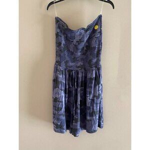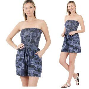 Zenana Women's Blue Camo Strapless Romper With Pockets - Size Medium