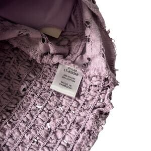 Coquette-style lace bralette in dusty mauve with a deep-V neckline, double spaghetti straps that criss-cross in back, and a comfy smocked panel for stretch. Removable pads; lined cups. Soft nylon/cotton crochet-style lace. Modern Y2K/festival vibe; great layered under sheer tops or cardis. Condition: Good/Gently used—light fuzz and a few tiny pulls
