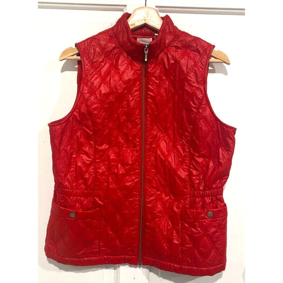 Stay warm and stylish with this Zenergy By Chico's red vest. The mid-length vest is made of durable polyester material with a solid pattern and a satin fabric type. The vest features a full zipper closure, long sleeves, and multiple pockets to keep your essentials safe. This lightweight rain jacket is perfect for any occasion and is machine washable for easy care. The vest is lined with soft polyester fleece to keep you cozy and warm while still looking fashionable. Upgrade your wardrobe with this versatile and stylish vest today.