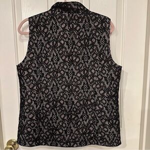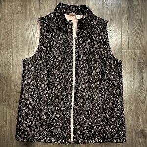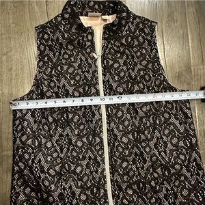 Elevate your style with this gorgeous Zenergy by Chico's vest in black lace with light pink accents. This lightweight piece is perfect for any season, featuring a mid-length and sleeveless design. The vest is made of 100% polyester crepe, with a zipper closure and elegant floral pattern accented by a stylish zipper.
