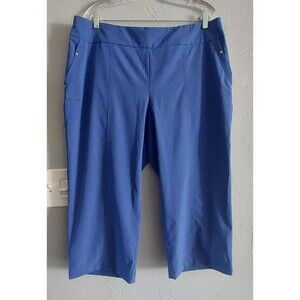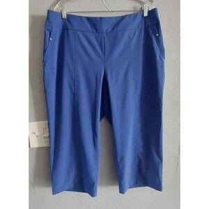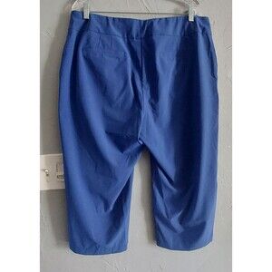 These Zenergy Golf pants by Chico's in women's size 2.5 are perfect for the active golfer. 36 inch waist and 20 inch inseam, The pull-on design, lightweight fabric, and athletic fit provide comfort and flexibility on the course. The mid-rise waist and flat front give a stylish look, while the cropped leg and slash pockets add practicality. Made from a blend of polyester and spandex, these pants are machine washable and suitable for multiple occasions, from casual wear to activewear for golfing or other activities. The solid blue color and Chico's Zenergy character make these pants a versatile and fashionable choice for the modern woman.