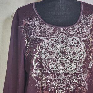 Zenergy Mauve Silver Foil Rhinestone Beaded 3/4 Sleeve Cotton Top Chico 3 US XL