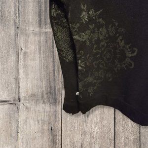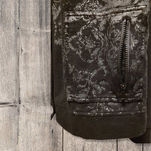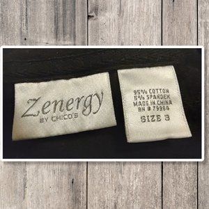 Zenergy black snap-up jacket, size 3. Collar is extra long to cover your neck. Two zippered pockets in front. Made in China - 95% cotton, 5% spandex. Very Good Used Condition.