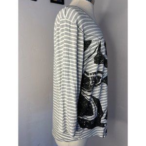 Chic Zenergy by Chicos 3/US XL16-18 gray and white striped tunic sequins and flowers. Comfortable 3/4 sleeve, round neck, stretchy and soft material. Machine washable, made in China. Chest 22, length 28, sleeve 19, sleeve from center of back 27.