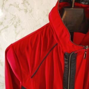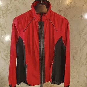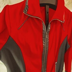 Size Chico's 3, 26 inches pit to pit, 26 inches long. Zip front, and zip pockets. 100% polyester, black contrast.
