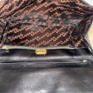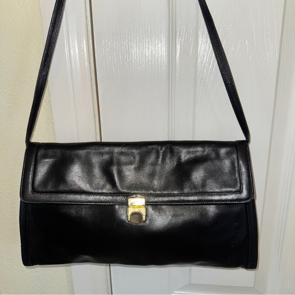 Stylish black leather bag with a striking gold accent. Ideal for versatile use.