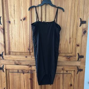 Black polyester and spandex. This dress has a lot of stretch to it. Adjustable straps. Back zipper. The fabric on the back of the dress is a bit sheer. Pit to pit measure is 20 inches. Length, not including straps is 33 inches.