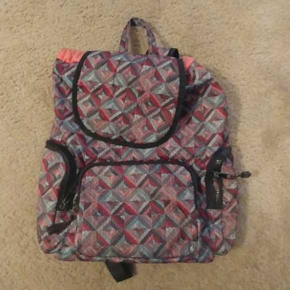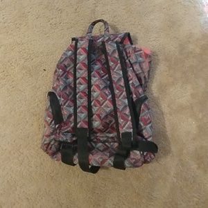 It has patterns all over ot and 2 side pockets and 2 front pockets