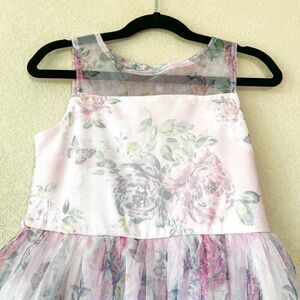 Excellent condition! Beautiful floral print tulle sleeveless dress with raised front hem- great for spring weddings, pictures, or anything worth dressing up for!