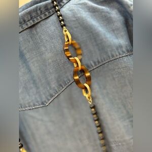 Tortoise w gold striations, matte gold links and black beads 39” length 3.5” extension