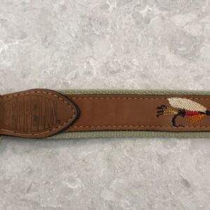 This is in excellent condition. It has a detailed fish lure design. The buckle is brass with slight wear.