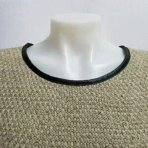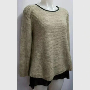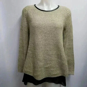 Zero Degrees Celsius Marled Tan Black Mixed Media Split Back Bow Tunic Sweater. Oversized A-line tunic style. Tag size small, fits size Small or Medium. Mixed Media sweater. Tan and black marled print with black faux leather trim. Crepe chiffon under layer, fully lined with split back and ribbon bow detail at the back. Acrylic wool blend. In excellent preowned condition. Paris, Parisian, preppy vibes.