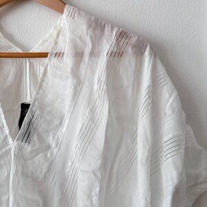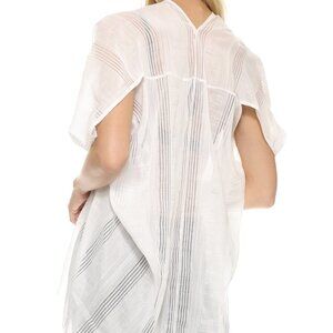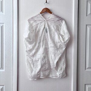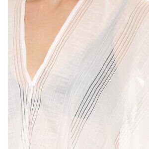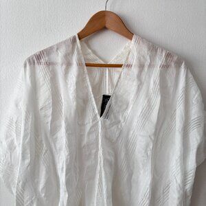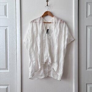 Lightweight, oversized, short sleeved top with V-neckline at front & back, set-back armholes, & curved hemline. Slips on.