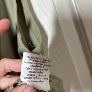 Item has pockets. Color looks like a neutral/cream color but is more of a lighter shade of green.