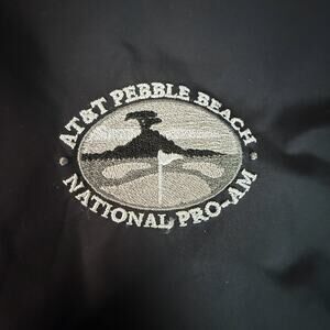 This is a men’s AT&T Pebble Beach National ProAm Golf Jacket by Zero Restriction in black with embroidered Pebble Beach National ProAm logo on the chest. Made in China with a 100% polyester shell. The full-zip windbreaker features zip-pockets, elastic cuffs and hem, and subtle reflective piping on the back across shoulders. Ideal for golf outings, resort wear or sporty casual layering. The condition is good — previously worn but well maintained with no visible stains, holes or heavy fraying. Check photos for all details and condition.
