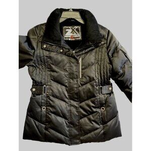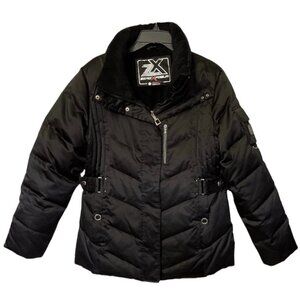 Zero Xposur ~ Women's down-filled black puffer ski / snow / winter weather jacket. Size Large. Front pockets have fleece linings and snap closures. Zippered breast pocket. Heavy-duty front zipper with snaps. Left sleeve has a snap cargo pocket. Lining is made of thick faux fur. Sleeves have a thick lining with separate ribbed under-sleeves.