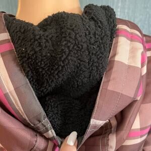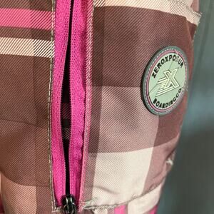 Zero Xposure, vintage, pink, brown plaid, pockets, bungee cords, hood, ski resort, winter, snow, warm, preppy.