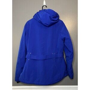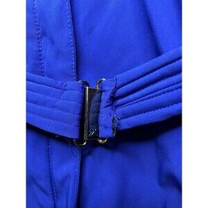 Features a bright royal blue outer shell, removable/adjustable hood, belted waist with silver-tone clasp, and two zippered front pockets. Quilted inner lining for warmth.