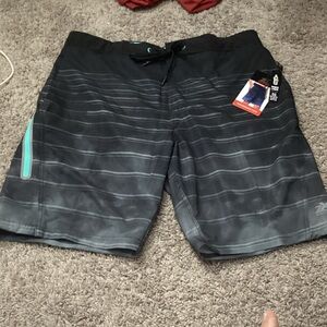 Modern swim shorts with sleek black and gray design. Features bold teal accents. Perfect for beach and pool.