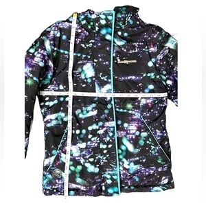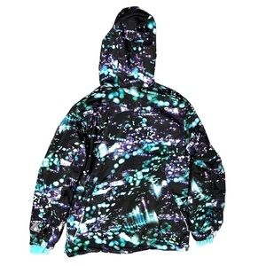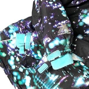 ZeroXposur Girls Black Puffer Hooded Jacket. Size Large (10/12). Black with teal blue inside and patches on the outside. Excellent preloved condition! Weather resistant to keep the kiddos toasty! Measurements in pics, however additional measurements available upon request.