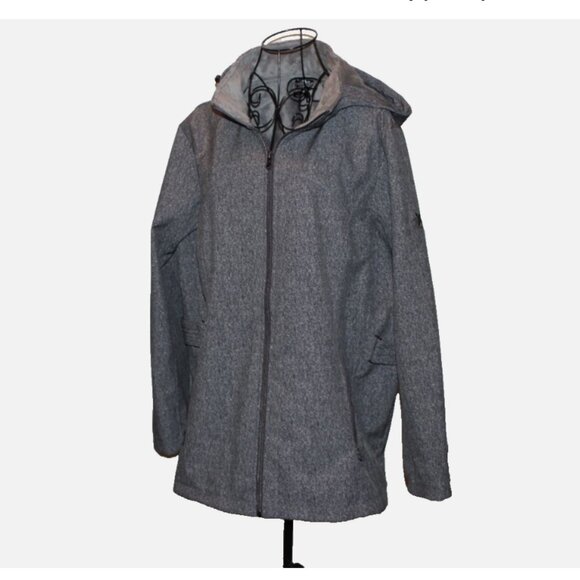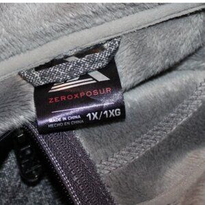 ZeroXposur gray fleece lined zip front jacket with zippered pockets and a removable hood. Size 1X, bust is 52", length is 28", sleeve length is 24". Polyester/spandex fabric. Like new.